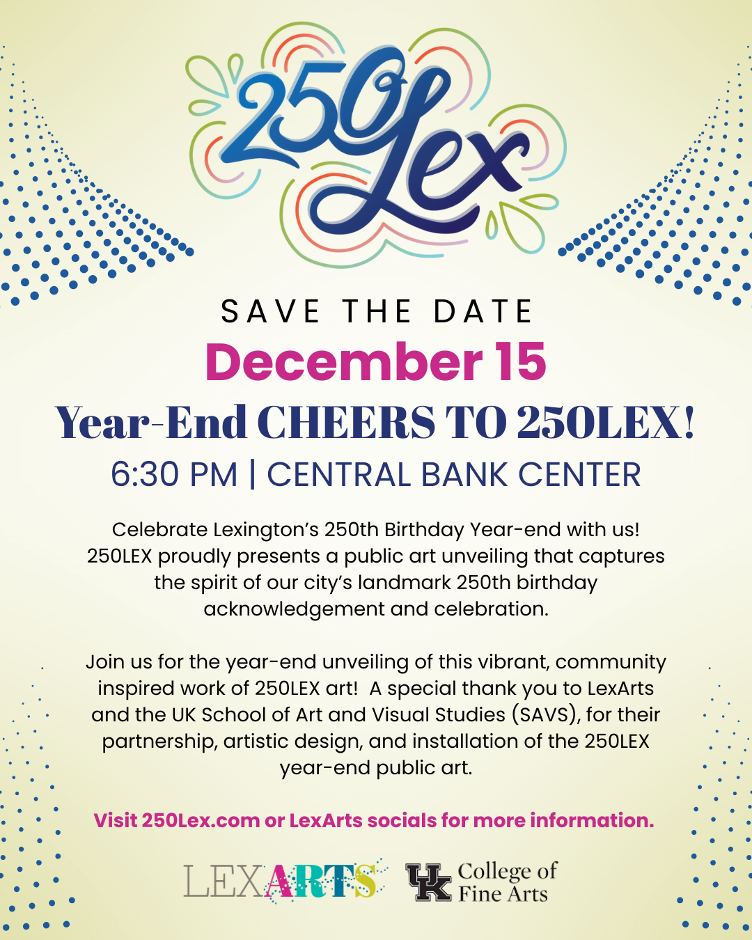 Celebrate Lexington’s 250th Birthday Year-end with us! 250LEX proudly presents a public art unveiling that captures the spirit of our city’s landmark 250th birthday acknowledgement and celebration. Join us for the year-end unveiling of this vibrant, community-inspired work of 250LEX art! A special thank you to LexArts and the UK School of Art and Visual Studies (SAVS), for their partnership, artistic design, and installation of the 250LEX year-end public art.